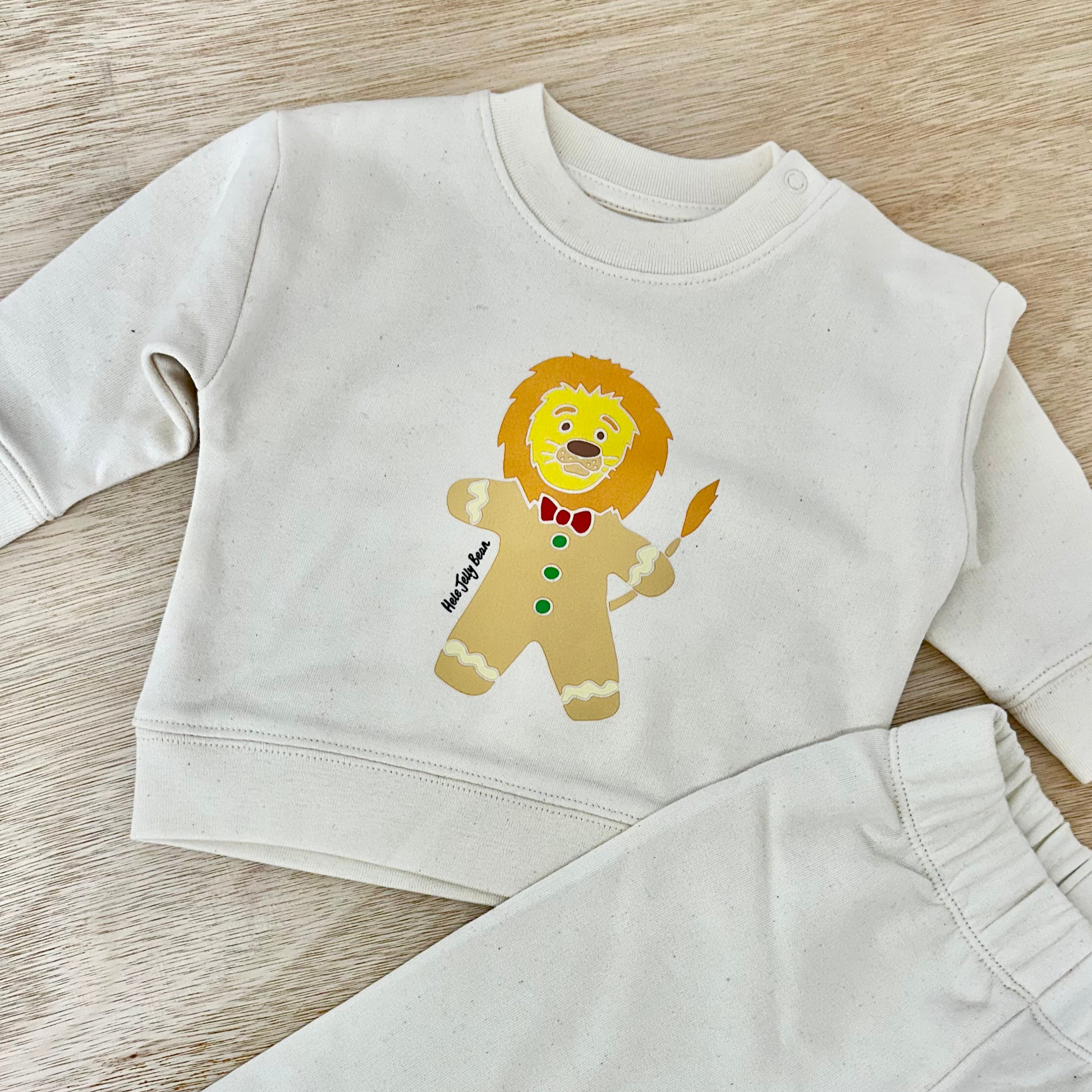 Let your little one roam the day in style with our Gingerbread Lion Organic Cotton Kids Sweater Set! This adorable matching set, perfect for ages 0-3 years, features a cozy sweatshirt with a playful Gingerbread Lion design on the front and unprinted soft jogger bottoms. The set is made from 85% raw natural organic cotton, 15% recycled polyester, offering ultimate comfort for your toddler, while the natural fleck texture gives the fabric a charming, earthy look.